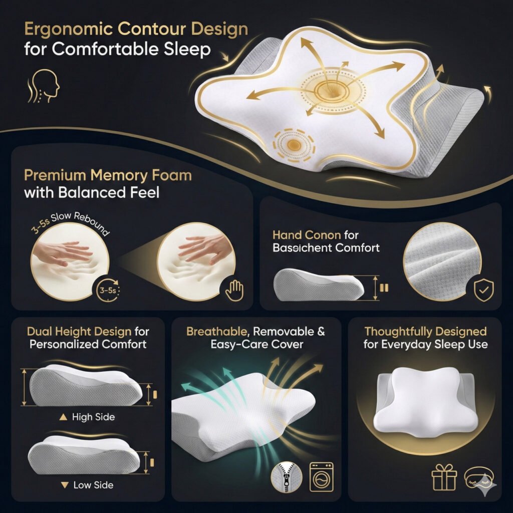 The TITARA Memory Foam Cervical Pillow is thoughtfully crafted to support a comfortable and relaxed sleep experience. Its contoured shape is designed to follow the natural curve of the head and neck, helping promote a balanced sleeping posture across different sleep positions.